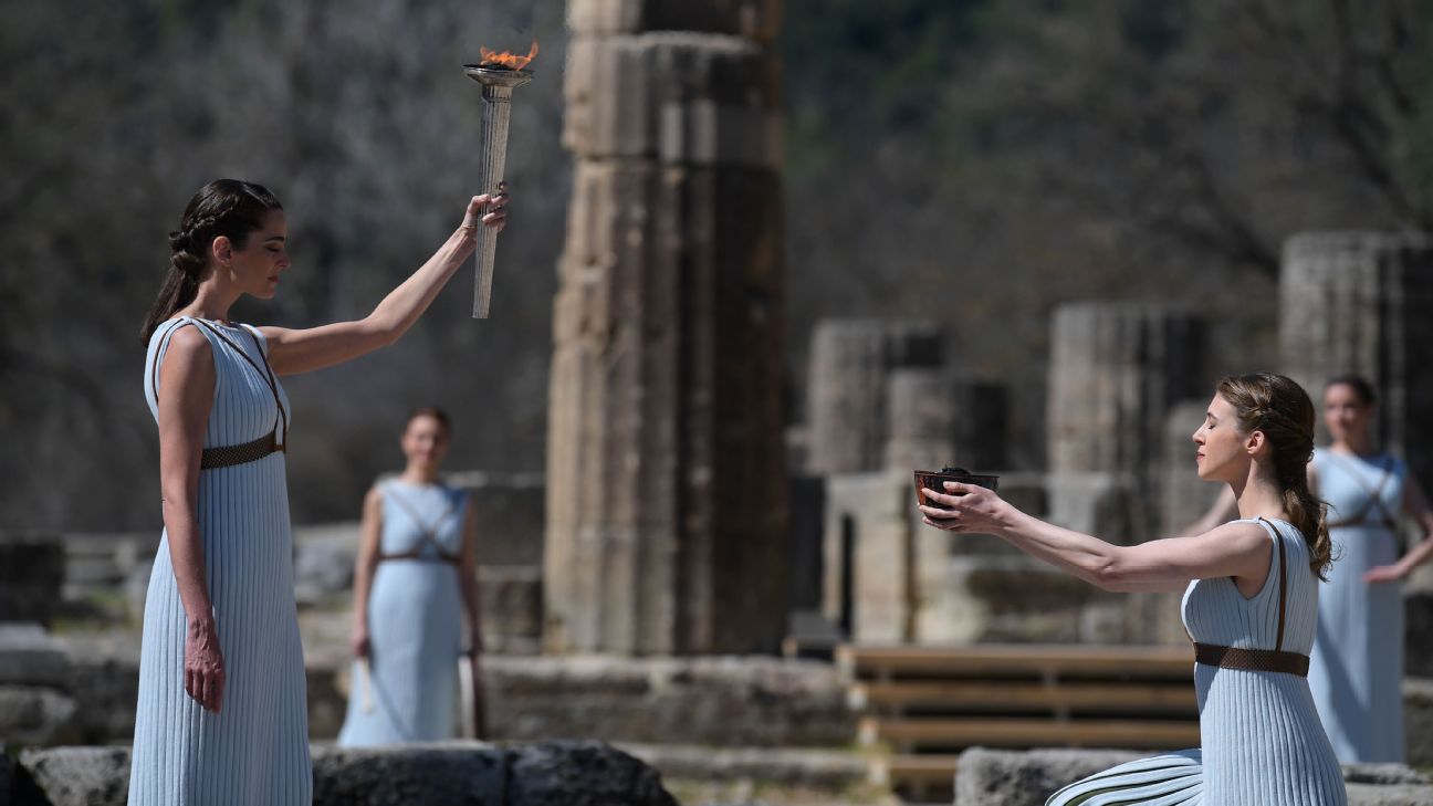 The flame for the Tokyo Olympics was lit Thursday at the birthplace of the ancient Games in a pared-down ceremony because of the coronavirus.